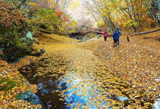 청송 주왕산의 단풍은 10월 말, 11월 초가 절정이다. 최고 명소는 절골계곡이다. 보통 입구에서 3.5㎞ 떨어진 대문다리까지 갔다가 돌아온다. 탐방로는 개울과 나란히 자갈길을 걷고 때로는 징검다리로 얕은 여울을 건넌다. 소풍 가듯 쉽게 걸을 수 있다. 대문바위 가까이 다다르면 넓은 암반에 고인 계곡물에 빨갛고 노랗게 물든 낙엽이 곱게 덮였다. 가을이 쌓이고 느린 시간이 흐른다. 잠시 다른 세상, 다른 시간에 떨궈진 것 같은 황홀한 착각에 빠진다.