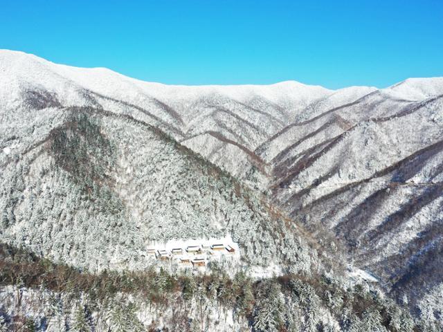 오대산 상원사 설경. 선재길은 아래쪽 월정사까지 계곡을 따라 연결돼 있다.