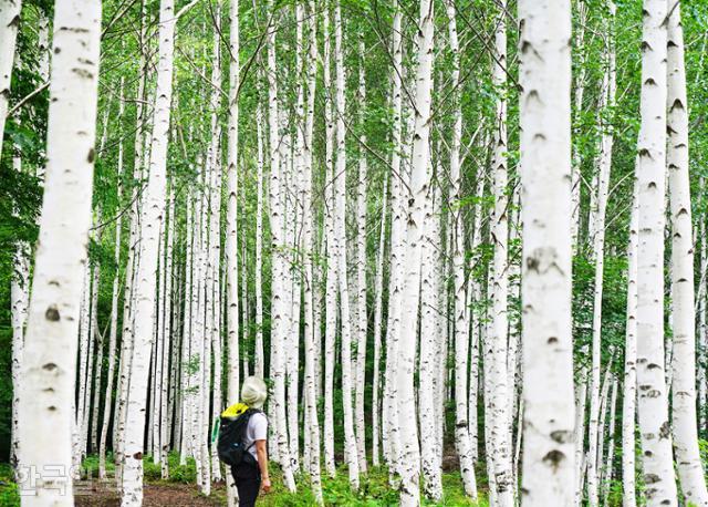녹음으로 가득한 숲에서 불현듯 나타나는 순백의 숲길, 완전히 딴 세상이다. 한 발 두 발 옮길 때마다 하얀 기둥이 슬로비디오처럼 다가왔다 멀어진다. 천천히 걸으면 두어 시간은 후딱 지나간다. 이따금씩 얇은 나뭇잎이 바람에 팔랑거리면 신선한 초록이 똑똑 떨어지는 듯하다. 하얀 숲이 내뿜는 청량함은 오히려 겨울보다 낫다.