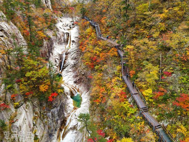 신흥사에서 약 1㎞ 구간은 순한 길이고, 비선대를 지나면 본격적으로 천불동계곡이다. 아찔한 절벽이 끝없이 이어지고, 하얀 물줄기는 바위를 타고 매끄럽게 흘러내린다. 수없이 많은 기암괴석을 불상에 비유한 천불동이다. 귀면암 고개를 넘고 가파른 계단을 올라 오련폭포에 닿으면, 설악산 단풍이 왜 최고인지 이해하고도 남는다. 새하얀 물줄기가 깊은 골짜기로 떨어졌다 고이고 다시 미끄러진다. 그렇게 생긴 다섯 개의 웅덩이마다 푸르스름한 옥수가 담겼다. 그 산비탈로 단풍이 흩뿌려져 있으니 감탄사가 절로 나온다.