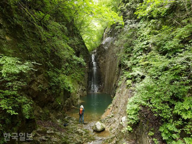 영천폭포는 탐방로에서 조금 비껴 있다. 깎아지른 절벽에서 떨어지는 물줄기가 에메랄드빛 소를 만들었다. 커다란 항아리에 양동이로 물을 쏟아 붓는 모양새다. 절벽에 자라는 우산나물과 돌단풍은 물기를 가득 머금고 있다. 햇볕이 거의 들지 않아 태고의 신비로움을 고이 간직한 모습이다.